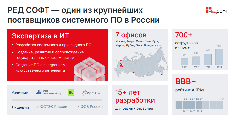 РЕД СОФТ это эффективная команда, имеющая более чем 15-летний опыт разработки в российском государственном и коммерческом секторе, а также за рубежом. Помимо решений, адаптированных под требования клиентов, компания создала собственную линейку продуктов, построенных на базе ПО с открытым кодом: РЕД ОС, СУБД Ред База Данных и Ред Платформа.
